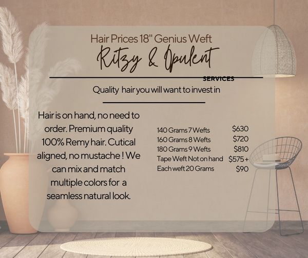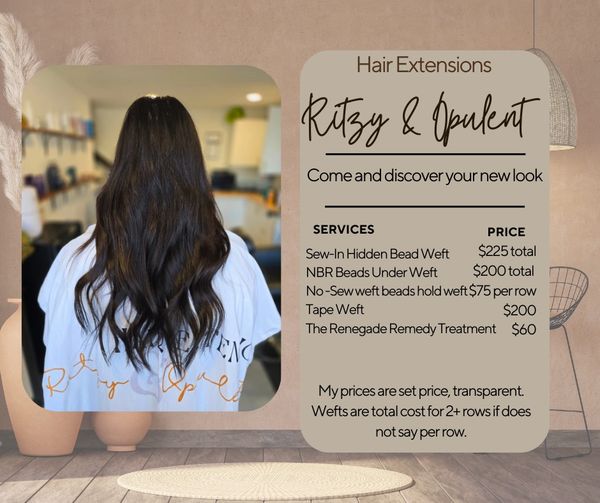 Operating under her exclusive brand, Ritzy & Opulent Hair Extensions, Robye offers premium extension services using her private-label line of Genius Weft hair, available in 18" and crafted for seamless, natural blends. Her installs are designed for comfort, longevity, and effortless beauty. When you sit in Robye's chair, you're not just getting extensions-you're stepping into a customized transformation experience backed by years of precision, passion, and professionalism.